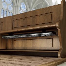 Das Heizelement ist in mattschwarzer Farbe lackiert und harmoniert sehr gut zu dem dunkeln Farbton des Holzes, aus dem die Bänke hergestellt sind. Auch Dank der Anbringung unter dem Sitz sind diese Infrarotheizungen für die Kirchenbesucher bei normalem Blick praktisch unsichtbar. Ein Standardbestandteil der Heizelemente ist auch das Schutzgitter, das die Besucher vor direktem Kontakt mit den Heizlamellen schützt. Die erste Applikation, in der diese Platten erfolgreich überprüft und installiert wurden, ist die St.-Gotthardt-Kirche in Bouzov.