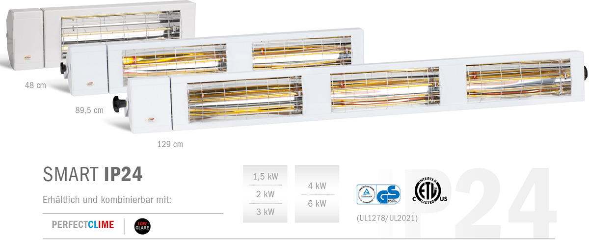 Die SMART MULTI-Serie bietet leistungsstarke Modelle von 3 bis 6 Kilowatt Gesamtleistung. Die Infrarot-Heizstrahler sind flexibel einsetzbar zur professionellen Erwärmung in Gewerbe- und Industrieobjekten sowei privaten Außenbereichen. Die innovative LOW GLARE-Technologie reduziert die herkömmliche Rotlichtabstrahlung der Heizröhren um ein Vielfaches.