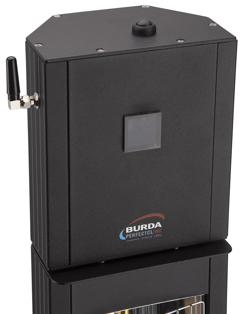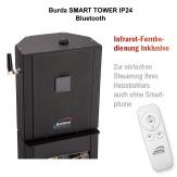 Der designstarke SMART TOWER Bluetooth wartet mit gleich zwei neuen Features auf. Mit einer Bluetooth Schnittstelle kann er ab sofort bequem mit der kostenlosen BURDA APP (IOS und Android) über das Smartphone und Tablet bedient werden. Neu ist auch die Aufwertung des Heizstrahlers mit der Spritzwasserschutzklasse IP24, die den vielseitigen, mobilen Einsatz in Außenbereichen erlaubt.