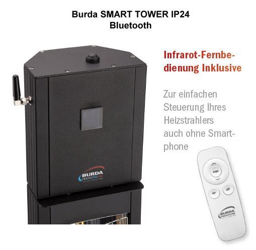 Der designstarke SMART TOWER Bluetooth wartet mit gleich zwei neuen Features auf. Mit einer Bluetooth Schnittstelle kann er ab sofort bequem mit der kostenlosen BURDA APP (IOS und Android) über das Smartphone und Tablet bedient werden. Neu ist auch die Aufwertung des Heizstrahlers mit der Spritzwasserschutzklasse IP24, die den vielseitigen, mobilen Einsatz in Außenbereichen erlaubt.