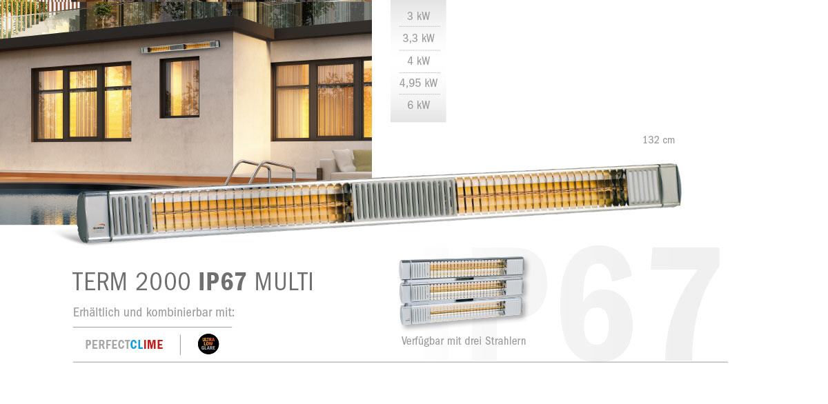 Doppelte Heizkraft mit 3.300 Watt! Der leistungsstarke TERM2000 MULTI IP67 ist ein hochkarätiger Terrassenheizstrahler, der mit einem Wärmebereich von ca. 28 qm auch größere Außenflächen erwärmt. Herzstück des absolut wasserdichten Strahlers sind zwei Infrarot Goldröhren mit einer Betriebslaufzeit von bis zu 5.000 Stunden. Das pulverbeschichtete Aluminiumgehäuse ist wasserdicht (IP67) und überdauert problemlos Schnee, Eis und Regen - selbst in ungeschützten Außenbereichen.