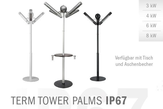 Der TERM TOWER PALMS ist mit zwei bis maximal vier wasserdichten Infrarotheizstrahlern der Serie TERM 2000 IP67 ausgestattet. Für die Steuerung der Wärmeintensität und Betriebslaufzeit empfehlen wir unsere Thermostate, Dimmer und Timer.