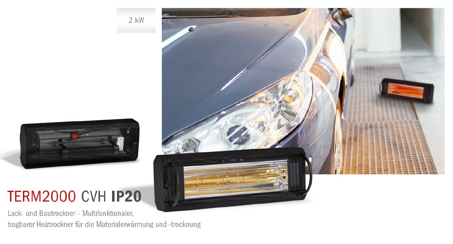 Die tragbare Variante des TERM 2000 wurde speziell zur problemlosen und effektiven Trocknung von Lacken, Farben und sonstigen Materialien entwickelt. Das Leichtgewicht mit nur 1,5 Kilogramm lässt sich mühelos transportieren und kann sowohl in horizontaler als auch in vertikaler Position angebracht werden.