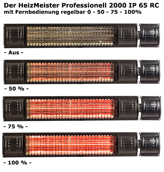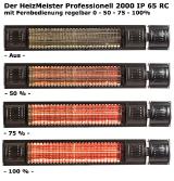 Der Heizmeister 2000 IP65 RC mit Fernbedienung und Dimmfunktion ist ein Heizstrahler der neuesten Generation ausgestattet mit einer HeLen-Goldröhre. Aluminiumgehäuse schwarz lackiert.